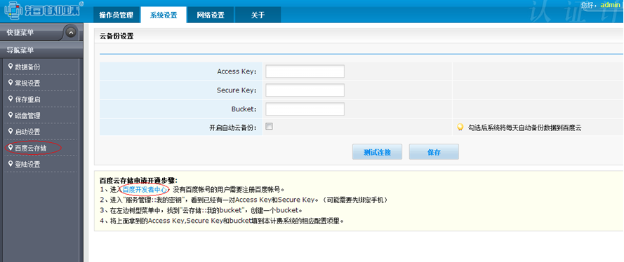 海蜘蛛计费系统百度云存储功能只有超级管理员(admin)才有操作权限。并且海蜘蛛计费系统版本号必须是Build20131009以后 |