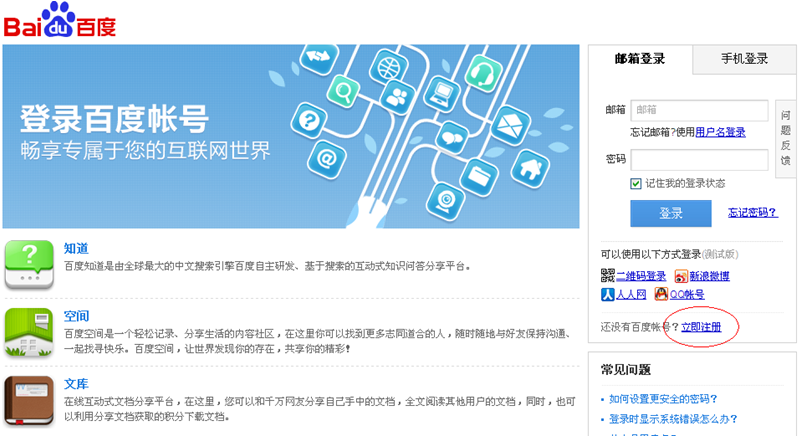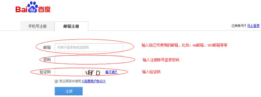 进入百度登录界面后,点击“立即注册”链接,会进入百度账号注册页面: