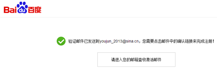 当通过邮箱方式注册成功后,页面会提示验证邮件已发送到你注册的邮箱中,需要在注册的邮箱的激活邮件来进行激活。如下图所示: