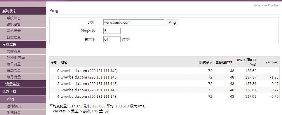登录海蜘蛛番茄系统,进入“诊断工具”-“Ping”,这里的ping可以是一个域名或者一个IP地址(外网或内网的)