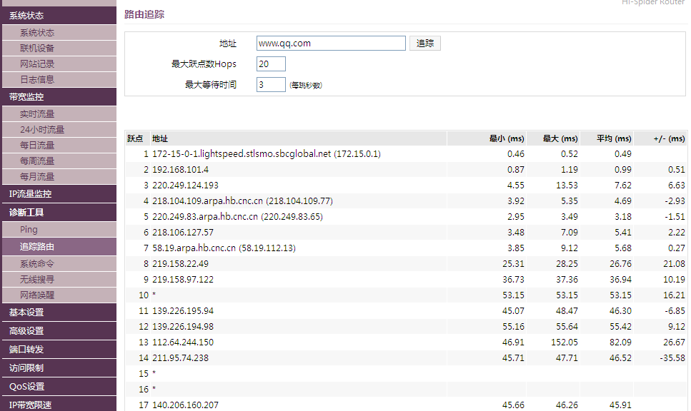 追踪路由指查询从此路由到目的地址所经过的路由跳数和延时信息,也可以是一个域名或者一个IP地址。