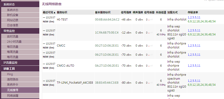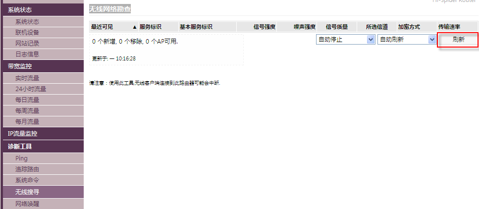 无线搜寻是指寻找周围的无线网络,方便设置本地的无线相关以免被干扰。进入无线网络勘查,点击“刷新”