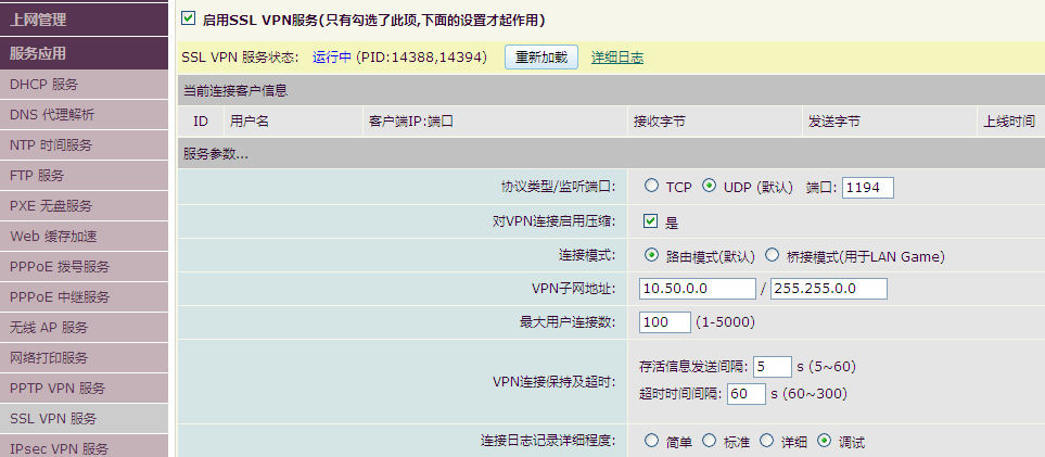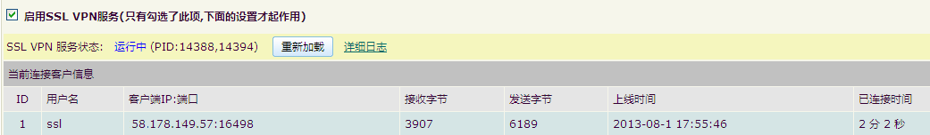 将这些配置保存并启动,配置正确时,在海蜘蛛SSL VPN服务端会显示连接信息
