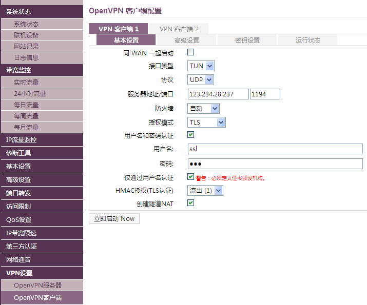 OpenVPN 客户端不能和PPTP客户端同时启用。 |