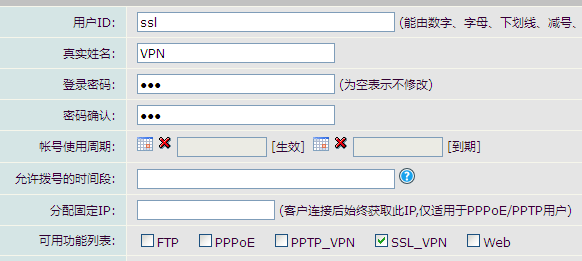 最后进入服务应用-用户帐号管理中,建立一个SSL帐号,自定义一个用户密码,在可用功能列表中勾选SSL_VPN