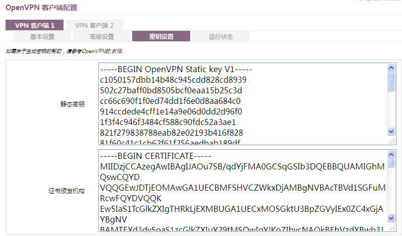 将海蜘蛛服务端导出的sslvpn_certkey.tar文件解压后的文件夹打开,将ta.key用记事本打开,复制到密钥设置标签中的静态密钥位置,将ca.crt用记事本打开,复制到密钥设置标签中的证书颁发机构位置